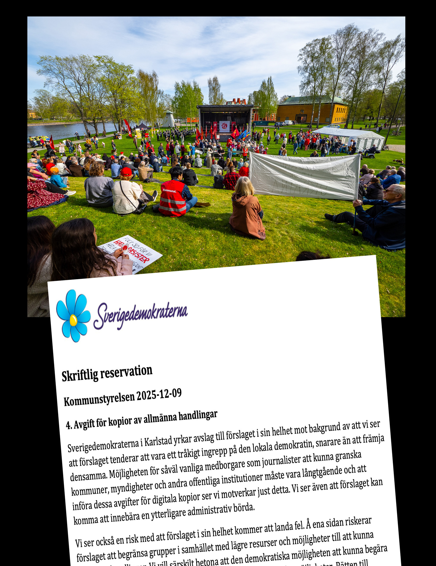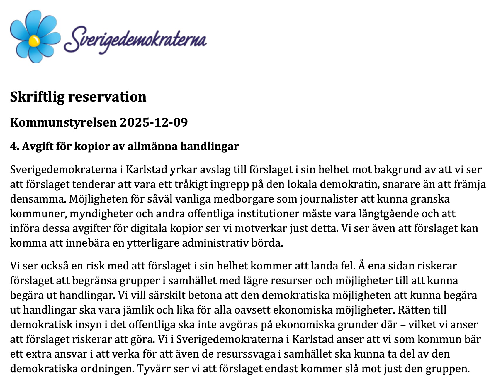 SD i Karlstad protesterade och röstade nej i kommunstyrelsen gällande avgifter på digitala PDF-filer, vilket enkelt och gratis har skickats till medborgarna. Men nu vill bland andra socialdemokraterna ta betalt av medborgare som vill granska makten. Förslaget kan drabba bland andra studenter och resurssvaga i samhället.