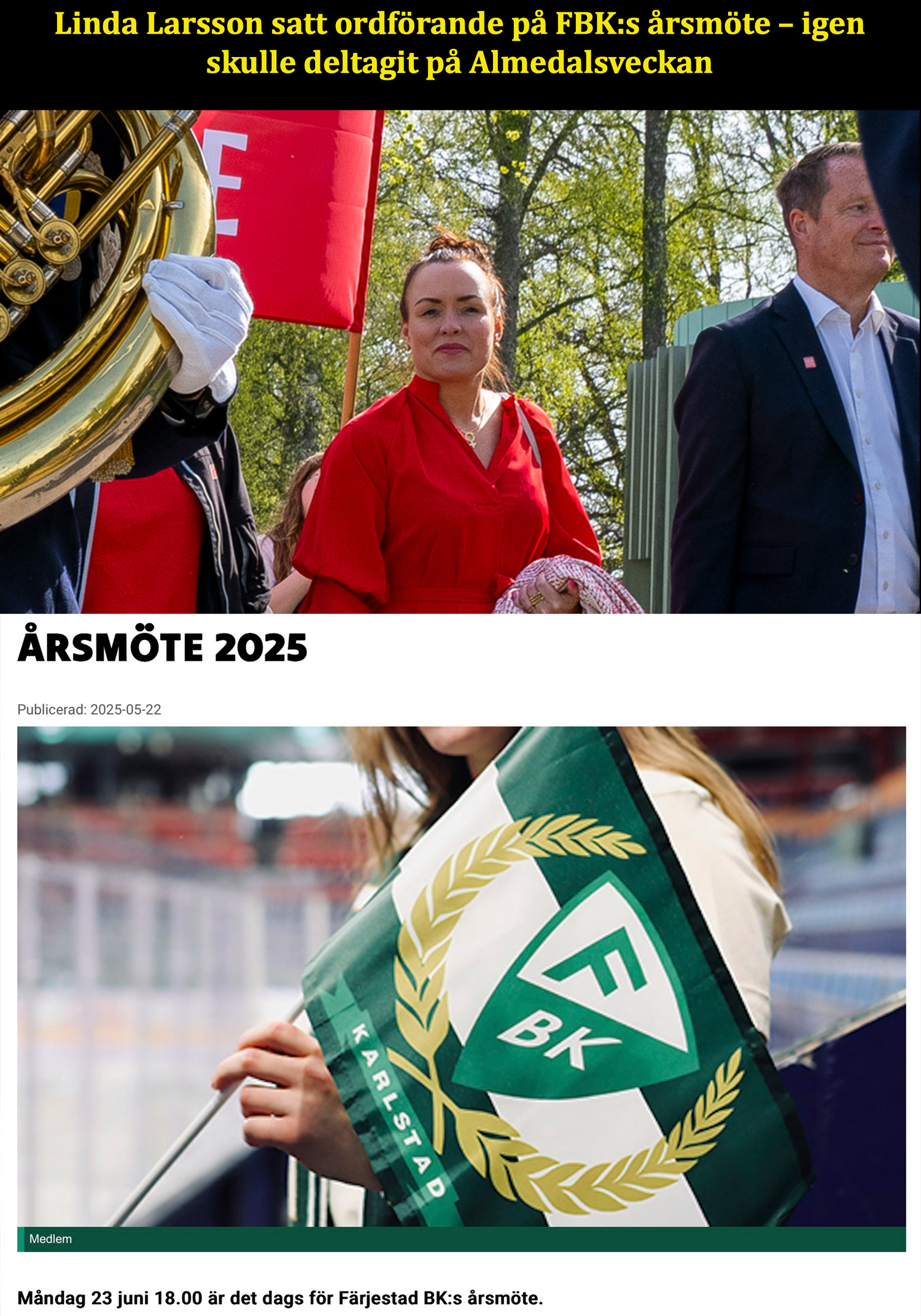 Linda Larsson satt ordförande på FBK:s årsmöte – igen – skulle deltagit på Almedalsveckan