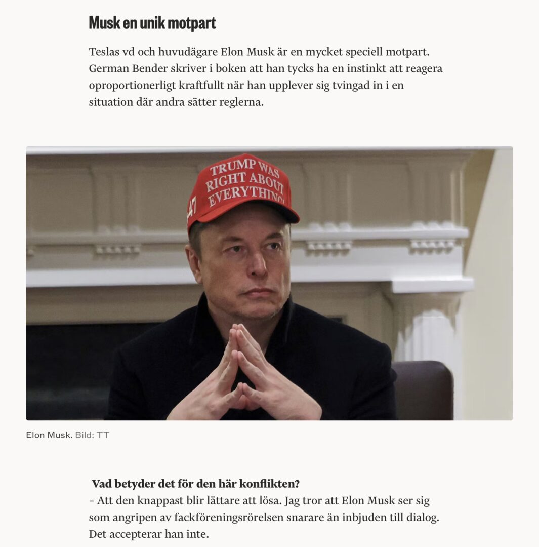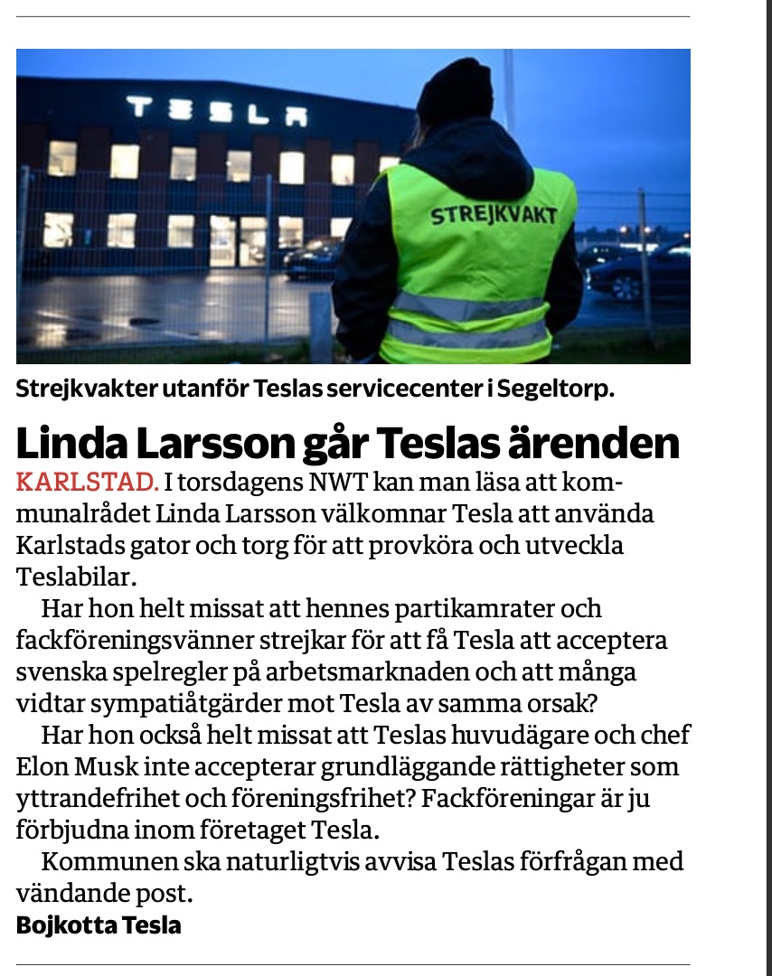 Kommunstyrelsens ordförande Linda Larsson i ett mejl om bolaget Tesla: "Låter spännande och intressant". VF rapporterade först om detta. Forskaren German Bender har granskat Teslastrejken i en ny bok: