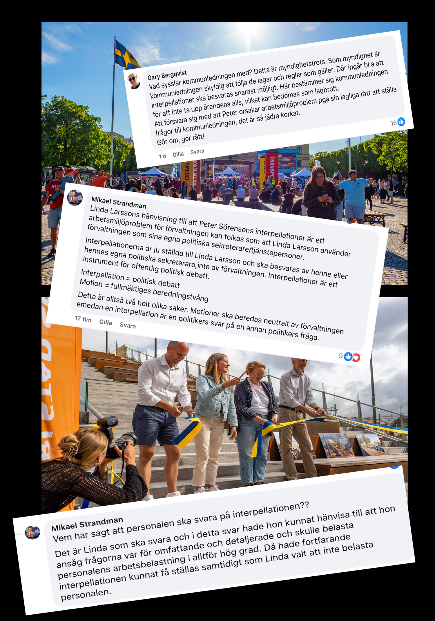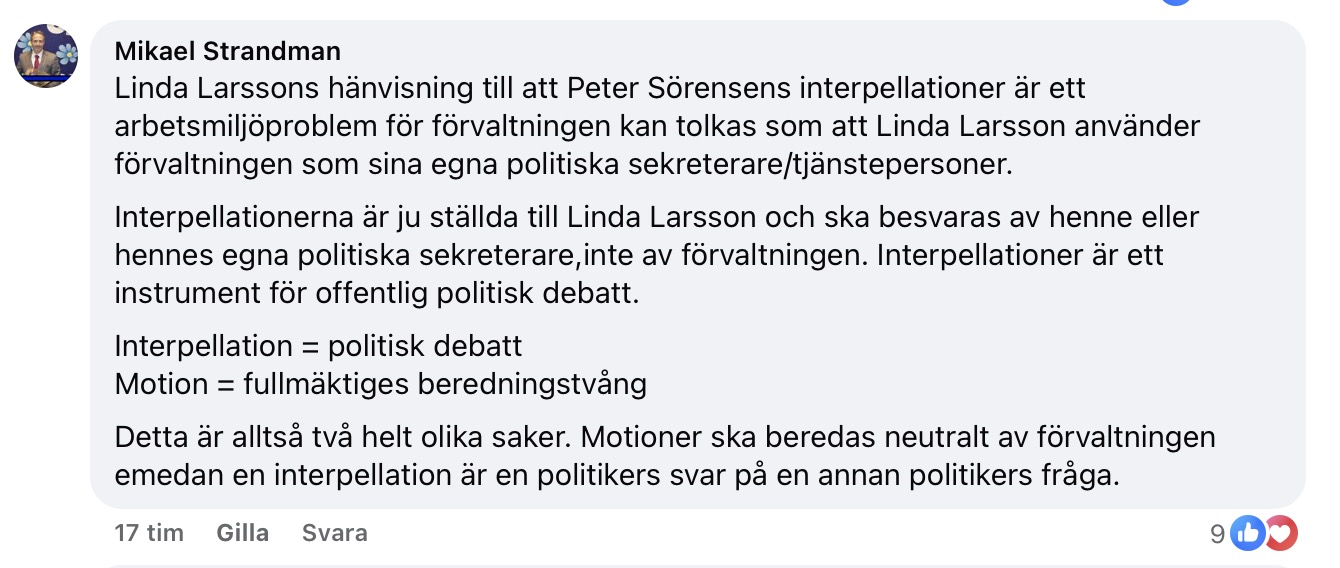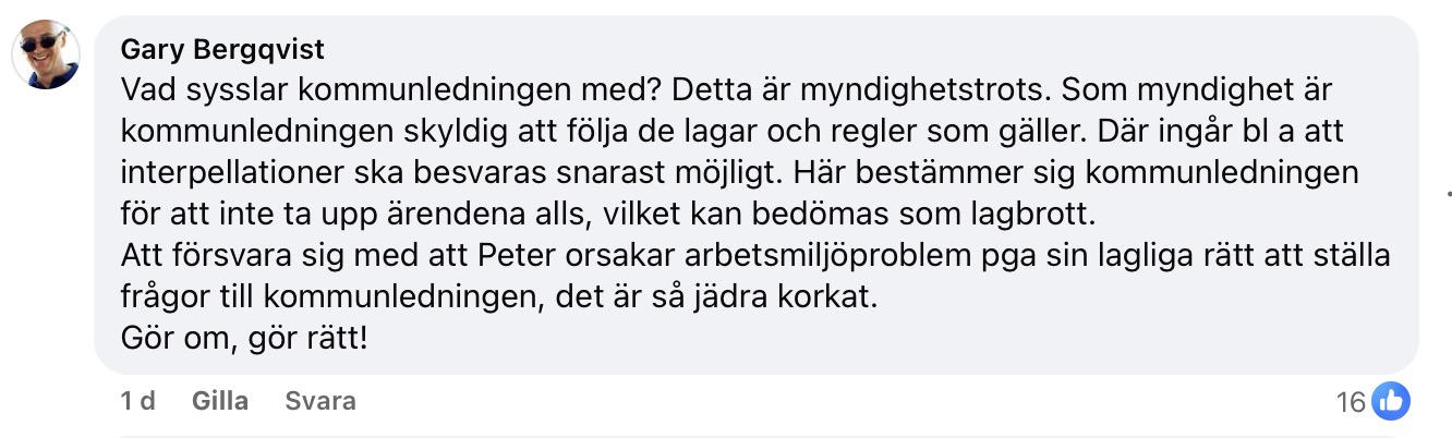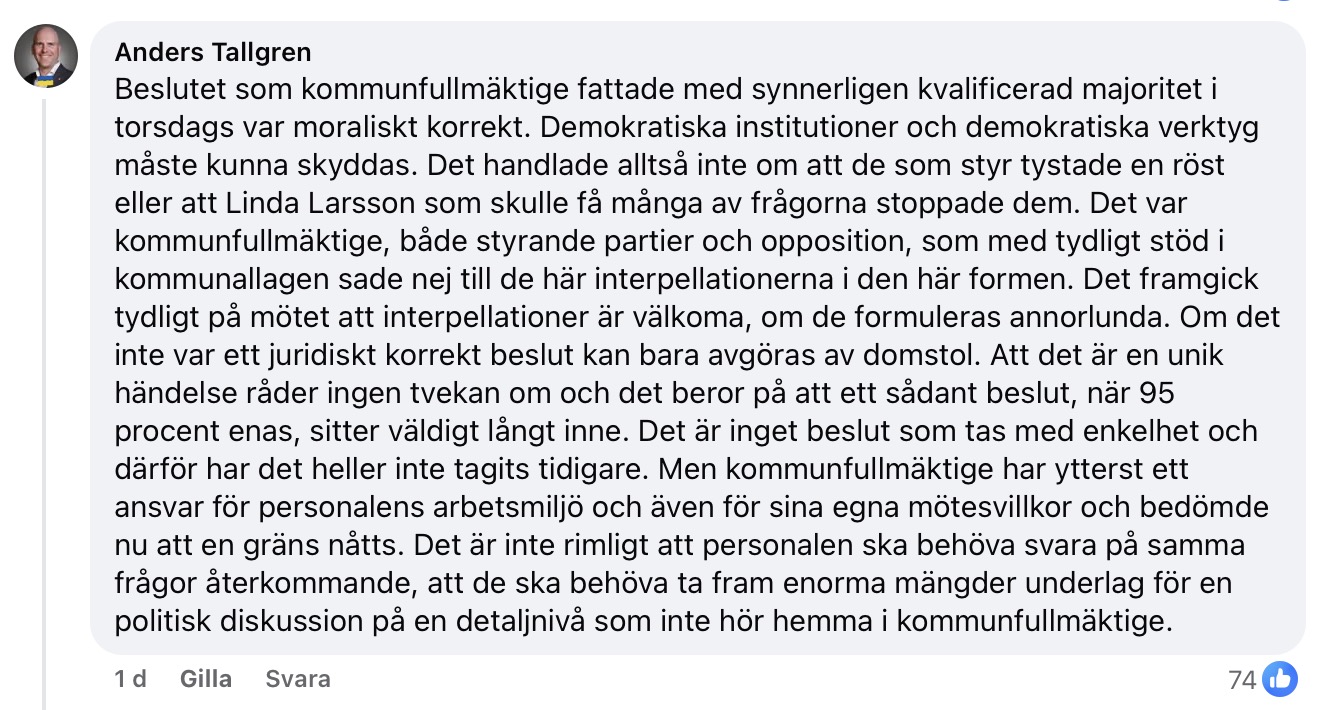 Kommunstyrelsens ordförande Linda Larsson säger till SVT att fyra personer jobbar heltid med att lämna ut allmänna handlingar till en fullmäktigeledamot. Men hon kan inte konkretisera detta. (Arbetstiden för fyra tjänstemän under en månad är hela 640 timmar. Reds, anm.)