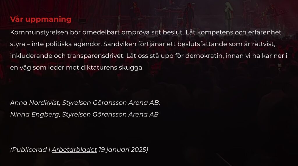 ”På sidan riktar de hård kritik mot Arbetarbladets granskning. Och mot kommunpolitiken – trots att Göransson Arena AB är ett helägt kommunalt bolag som styrs av just kommunpolitiken.”
